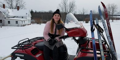The house at the left of this picture was part of a 5-building estate brought together by Wyman Kneeland Flint beginning in 1913. Flint used his property as a summer estate and a gentleman's farm. It later served as the campus of Nathaniel Hawthorne College. Most of his estate is now owned by Hawthorne Academy. The picture also shows one of our students ready for her cross-country skiing lesson.